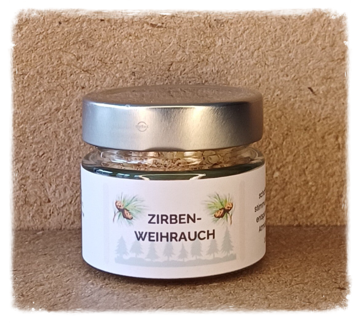 Die Räucherung *ZIRBENWEIHRAUCH* besteht aus einer sorgfältig ausgewählten Mischungen von Kräutern, Holz und Harz, welche eine stimmungsvolle, entspannende Atmosphäre schafft.