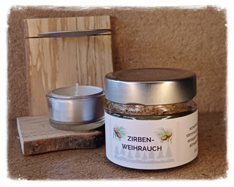 Die Räucherung *ZIRBENWEIHRAUCH* schafft eine stimmungsvolle, entspannende Atmosphäre.