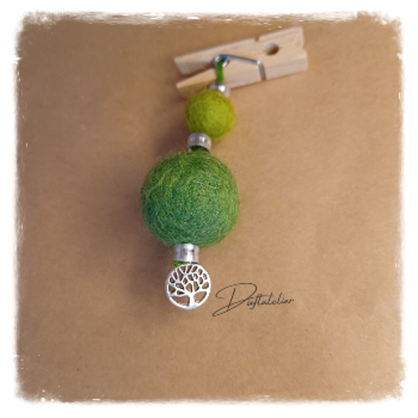 2 – 6 Tropfen von einem ätherischen Öl auf die Filzkugeln oder direkt auf das Duftklupperl tröpfeln.