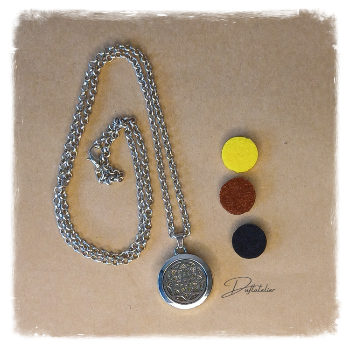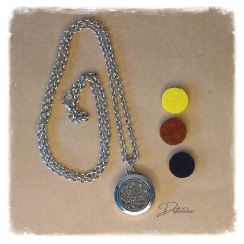 Nimm einen farbigen Filzpad mit der Wunschfarbe, tropfe 2-3 Tropfen des gewünschten Duftes oder des Duftöles auf den Filz, öffne den Anhänger und leg den Filz in den Anhänger.