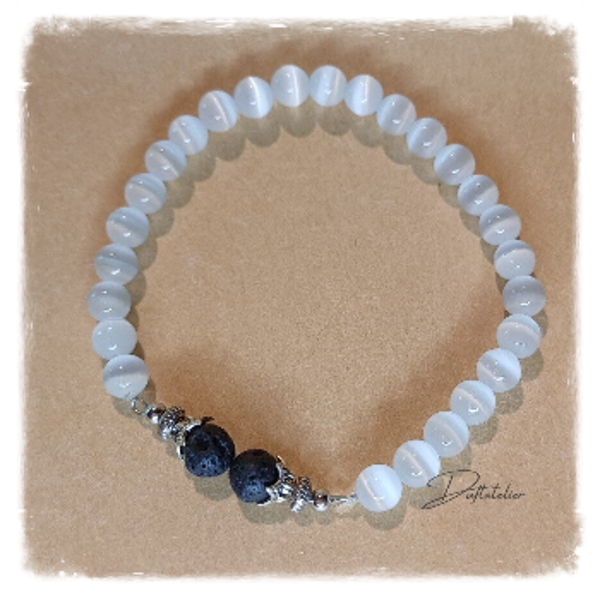Das AROMA - ARMBAND *Katzenauge weiß* mit Lavasteinen und Halbedelsteinen ist bestens geeignet, um Deinen Lieblingsduft über einen längeren Zeitraum zu tragen!