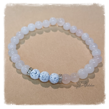 3 weiß gefärbte Lavasteine, 2 Zwischenperlen (nickelfreier Modeschmuck) und 26 Halbedelsteinperlen, aufgezogen auf einem hochwertigen Gummiband,