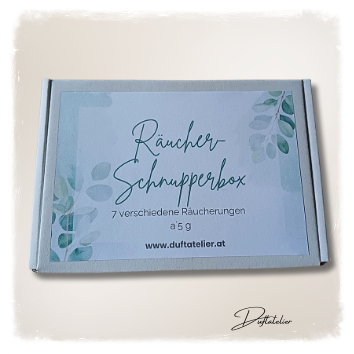 Dieses liebevoll zusammengestellte Schnupperbox enthält alle Räucherungen, die es im Duftatelier gibt.